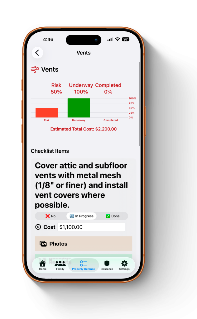 Record upgrades like ember-resistant vents, Class A roofing, noncombustible fencing, or dual-pane windows. Each item can include photos, receipts, and warranty info.