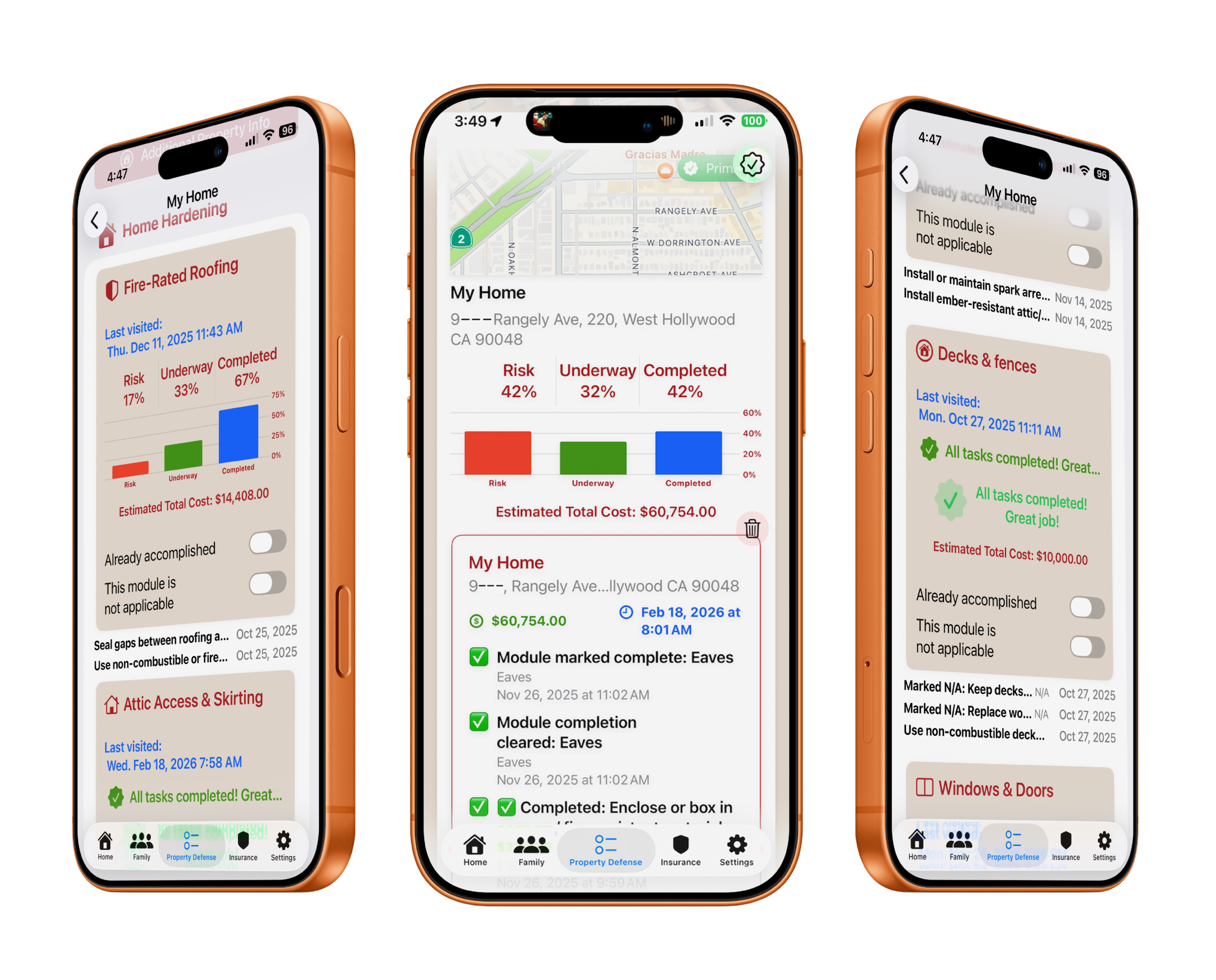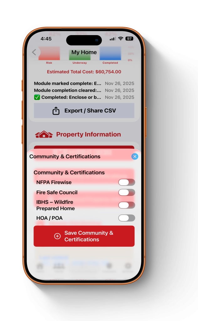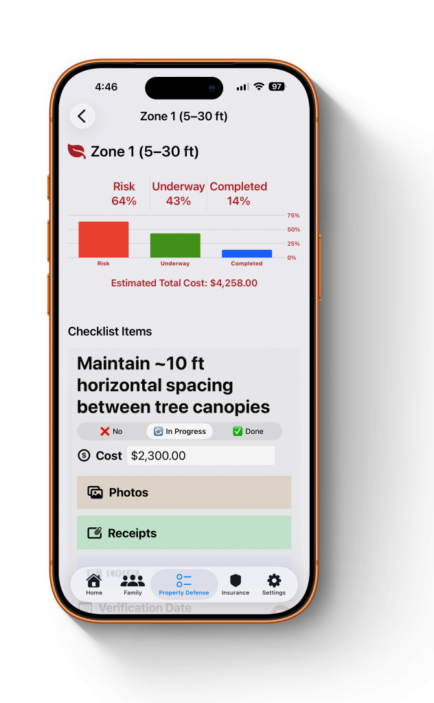 Walk your property with the app. Use guided checklists for defensible space (Zones 0–100 ft) and home hardening features.