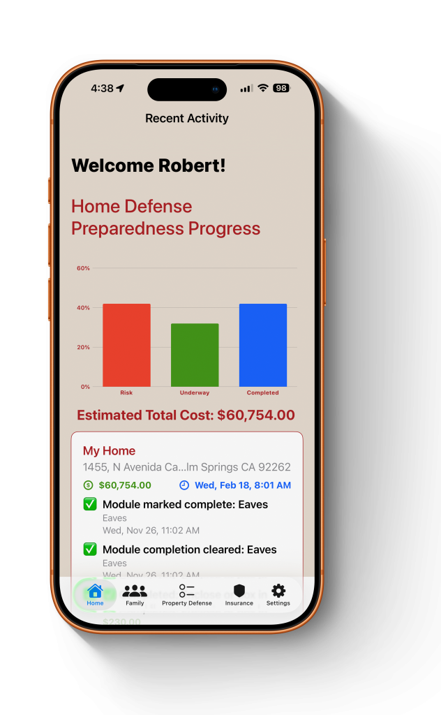 Aegis365 is a free home-hardening and defensible space app that helps you track work, document improvements, and generate reports your insurance company can actually use.